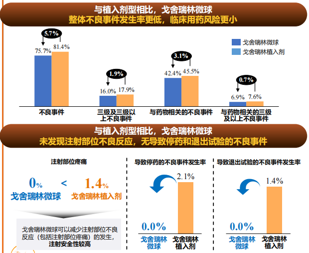 作為全球首個且唯一獲批的戈舍瑞林微球產(chǎn)品,百拓維從關鍵輔料到制劑均為我國自主研發(fā),且采用了二代乳化溶劑揮發(fā)法更新工藝,實現(xiàn)了高達90%以上的藥物包封率和批次間高穩(wěn)定性,并改善藥物的釋放效果。該產(chǎn)品打破了20多年來進口戈舍瑞林植入劑的壟斷地位,而且沒有單純仿制早先上市、不夠先進的微球制劑,而是選擇走劑型改良的開發(fā)策略。目前注射用戈舍瑞林微球用于前列腺癌的臨床III期研究論文已公布,從研究結果來看,注射用戈舍瑞林微球的去勢成功率與戈舍瑞林植入劑相當:該研究采用非劣效性設計,治療29天時(起始治療后的第2次注射)兩組去勢患者比例分別為99.3%和100%,維持至第85天時(起始治療后第3次注射)的比例則分別為99.3%和97.8%,注射用戈舍瑞林微球療效達到非劣于戈舍瑞林植入劑的標準。在主要終點及其它次要終點表現(xiàn)相當?shù)那闆r下,注射用戈舍瑞林微球組患者注射部位不良反應(如疼痛、紅腫等)發(fā)生率顯著低于戈舍瑞林植入劑組(0 vs. 1.4%),證實了其改善患者治療體驗的價值,畢竟傳統(tǒng)植入劑注射針頭有1.6毫米粗,而注射用戈舍瑞林微球針頭外徑僅為0.8毫米,改善顯而易見;此外,研究中也未發(fā)現(xiàn)與注射用戈舍瑞林微球治療相關、并導致停藥和退出研究的不良事件[7]。復旦大學附屬腫瘤醫(yī)院副院長、泌尿腫瘤 MDT 首席專家葉定偉教授指出,注射用戈舍瑞林微球在臨床療效和安全性與植入劑型一致,注射方式、患者體驗更佳,為前列腺癌臨床治療提供了更多選擇。